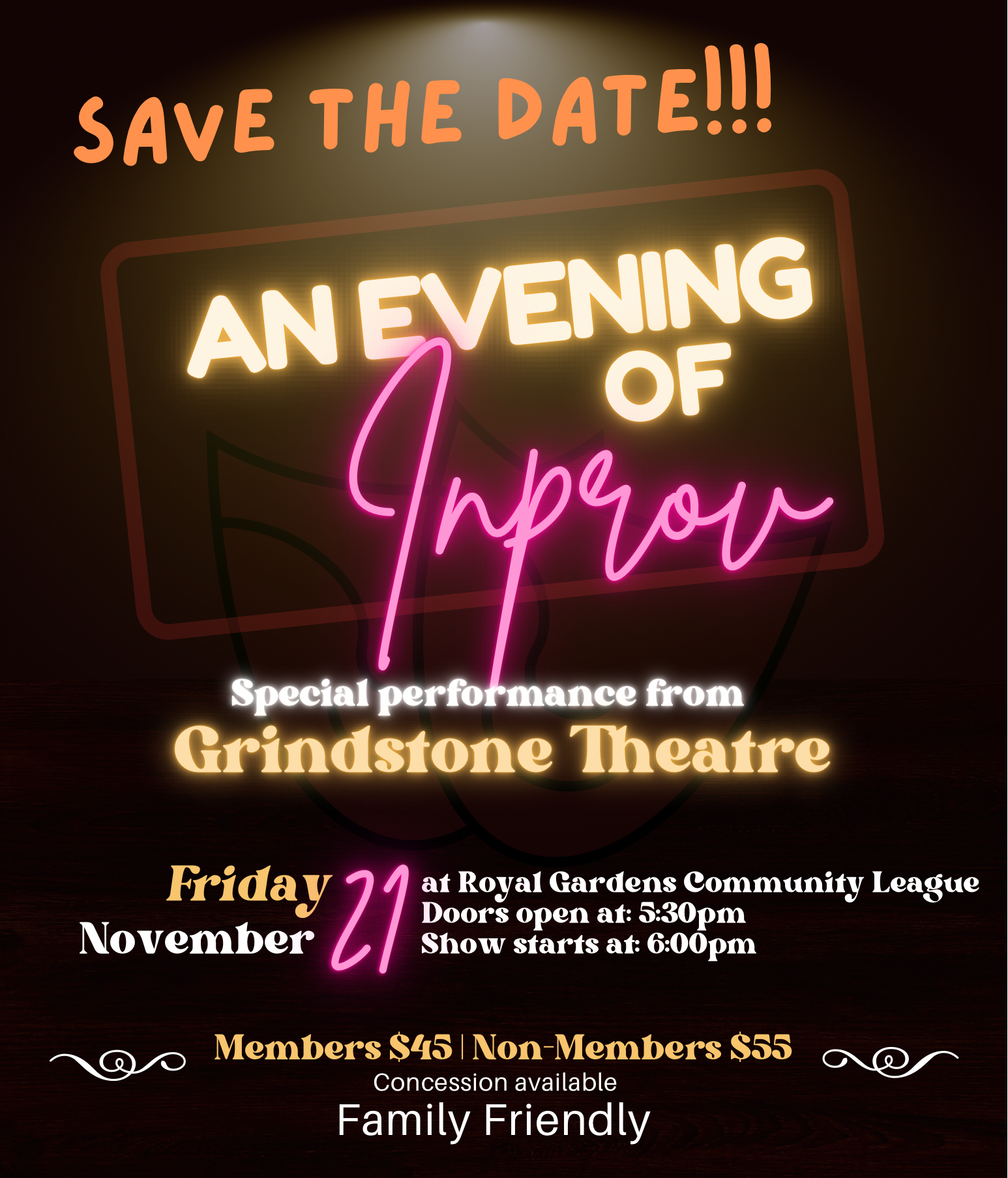 Join us for a night of laughs and entertainment with a special performance from Grindstone Theatre at the Royal Gardens Community League.