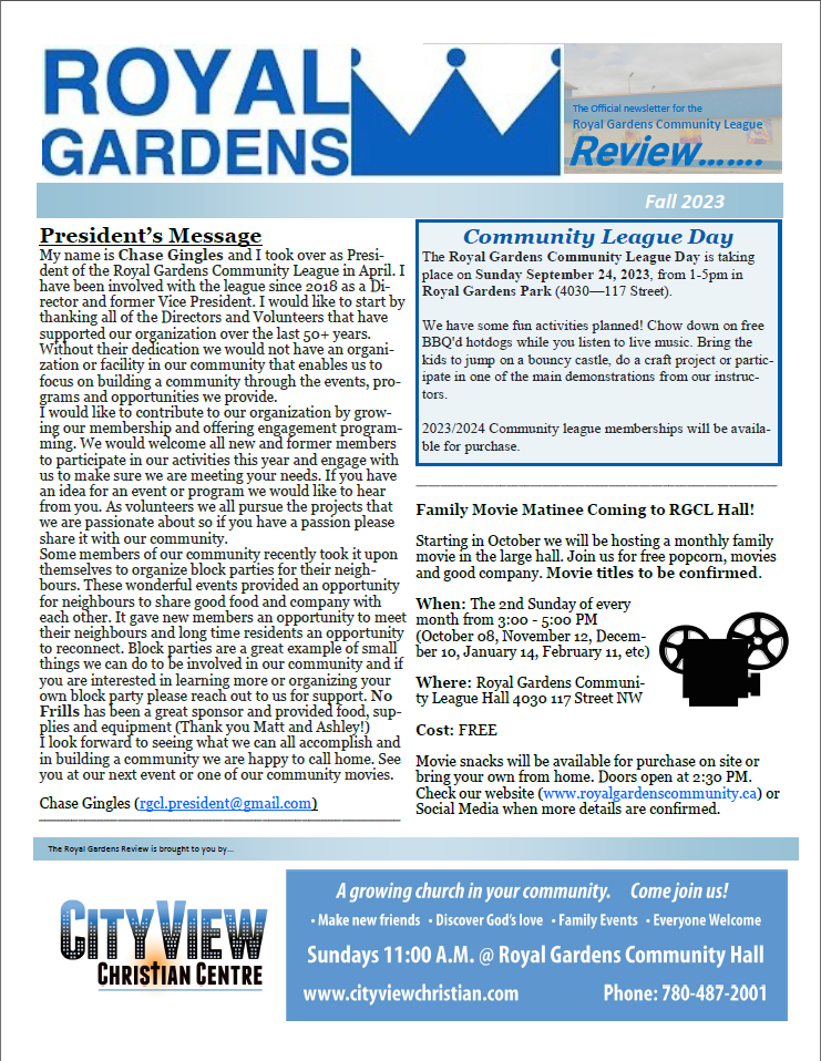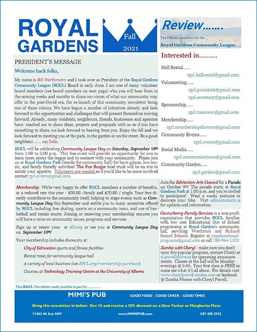 The Royal Gardens Community League publishes a tri-annual newsletter covering up to 4 pages of news and events from throughout our beautiful south side neighborhood. We hand deliver to over 1400 addresses between the Whitemud freeway and 40th Avenue and 111 Street and 119 Street in the fall, winter, and spring.